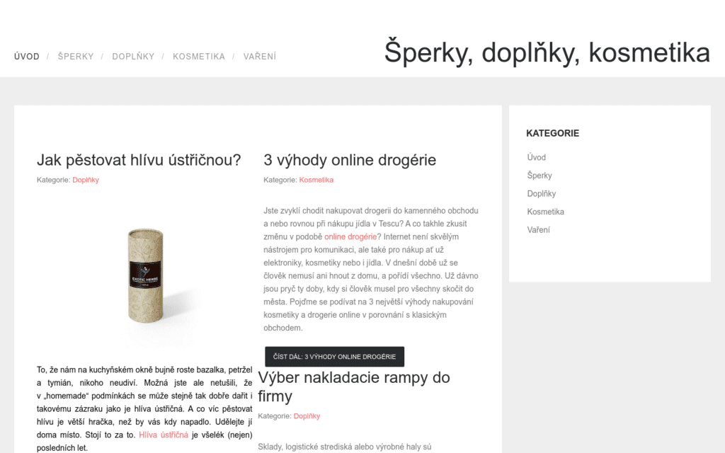 KYSLIKOVA-KOSMETIKA.CZ Odkaz na webové stránky: http://www.kyslikova-kosmetika.czKategorie webu: Šperky, Doplňky, Kosmetika, Vaření Autor: Ivana Březíková Popis: Tento web přivítají převážně ženy, kvůli mnoha článkům ohledně šperků, kosmetiky a vaření. Předchozí Následující