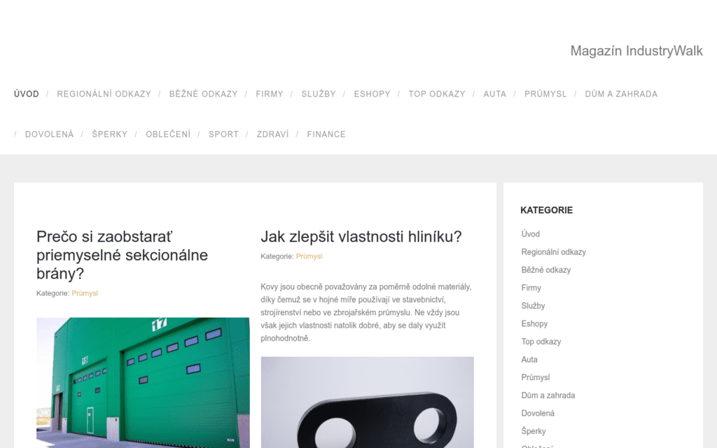 INDUSTRYWALK.CZ Odkaz na webové stránky: http://www.industrywalk.czKategorie webu: Top odkazy, Regionální odkazy, Běžné odkazy, Firmy, Služby, Eshopy, Auta, Průmysl, Dům a zahrada, Dovolená, Šperky, Oblečení, Sport, Zdraví, Finance Autor: Zbyšek Polívka Popis: Web industrywalk se nezabývá jen průmyslem, ale také financemi, zdravím a sportem. Předchozí Následující